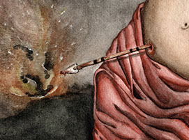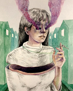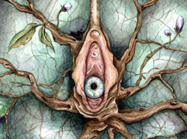"En mi caso ha sido todo muy raro. Un año y medio antes de embarazarme empecé a tener problemas y preocupaciones con mis ciclos menstruales, dolores, sangrados y la sensación de que algo no estaba bien. Y a raíz de eso empecé a cambiar el discurso en mis pinturas. En ese tiempo decidí dejar de hacer “cosas bonitas” y comenzar a pintar mis miedos y pesadillas con respecto a ser mujer. De alguna manera empecé a conectar mas con mi propia feminidad. Luego se vino el embarazo y muchas de las cosas que había pintado antes parecían ahora premonitorias de otras cosas más. Desde entonces en mis pinturas personales he estado dedicada a pintar mis sueños y pesadillas de ser mujer. Ahora mismo estoy trabajando en una serie de pinturas que hablan directamente de la “Maternidad Bizarra”. Por otro lado, ya que me ha costado mucho sacar tiempo para esa serie, he estado teniendo que hacer pinturas o dibujos en formatos más pequeños mientras sigo en recuperación de una reciente histerectomía abdominal. Ese tema también ha sido parte de mi trabajo últimamente. He perdido muchos seguidores en el camino y hay quien ha tachado mi trabajo de “asqueroso” pero no me importa. Creo que he ganado muchísimo más desde que decidí dejar las entrañas en el papel."