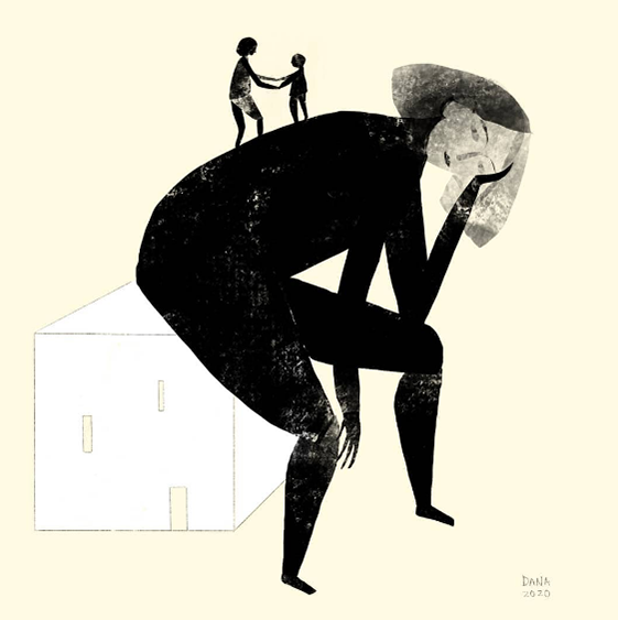 Cuando comencé a dibujar, los primeros dibujos que pude hacer recién al final del confinamiento, Malena se sentó a mi lado a mirar, y me dijo: Mamá, esta es La Casa Caja, escribílo al lado así no te olvidás.