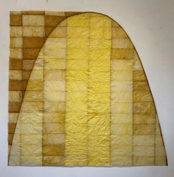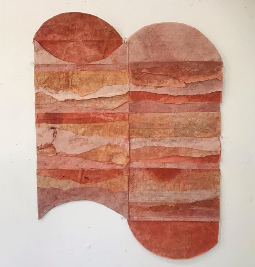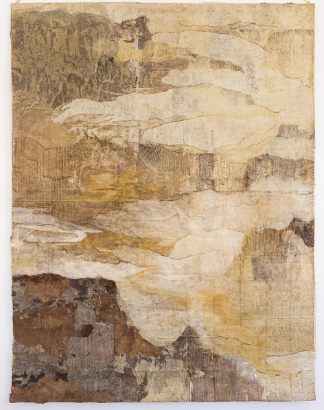 Esta exploración comenzó con una pauta que me di a mí misma cuando mis hijos eran bebés; me decía "¿Cuáles fueron las dos cosas que más extraño desde que tengo hijos?" Mi respuesta fue: “uno, dormir; dos, trabajar en mi arte a diario ". Siguiendo este pensamiento, comencé a poner papel Kozo debajo de las sábanas de mi cama, para acostarme mientras dormía con mi bebé. Volviéndose arrugado y rasgado, el papel trazó un mapa del movimiento de nuestros cuerpos mientras giramos y nos movíamos a lo largo de la noche. Después de una semana, cuando cambié las hojas, el papel se transformó en un collage de papel que evocaba la piel que había estado tocando. Esta pieza se convirtió en la primera de las diez obras que componen la serie Queen Sheets, todas con el tamaño estándar de una cama tamaño 80 ”x 60” (2mx1.5m).
