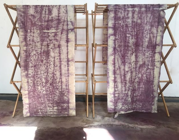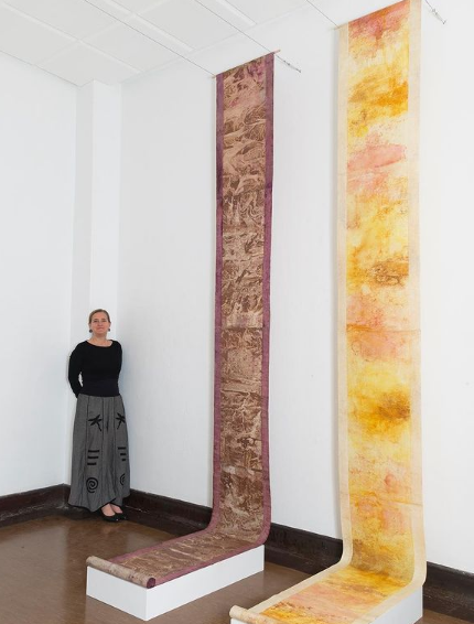 Parte importante de su trabajo es recolectar plantas y otras materias primas, con las que crea pigmentos y mancha sus lienzos y telas de algodón. Experimenta con la exposición de estos materiales a elementos naturales, sol, lluvia, agua… lo que conecta su obra al tiempo y el lugar. También usa herramientas domésticas como quemadores de cocina, planchas, lavadoras agregando marcas de ‘domesticidad’ a la textura del trabajo.
