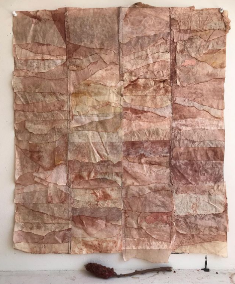 Su trabajo casi se puede oler y sentir. Está inspirado en procesos naturales, recuerda a las grietas en la tierra seca del desierto, las manchas y arrugas que aparecen en nuestra piel por el envejecimiento, las texturas y colores abigarrados del desierto donde vive.
